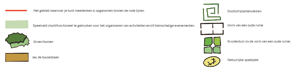 - Het gebied waarover je kunt meedenken is opgenomen in de gestreepte rode lijnen in onderstaande afbeelding. Het gebied is circa 4900 vierkante meter ( 70 x 70 meter) groot.